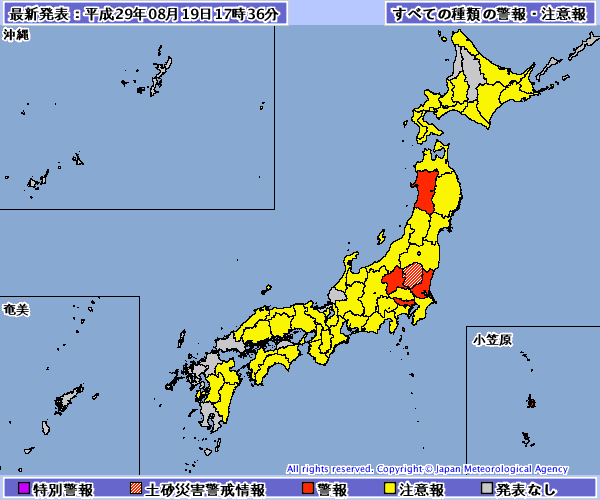 Hay alertas similares en varias localidades de Ibaraki, como Mito y la misma ciudad de Ibaraki shi, y por fuertes lluvias de 70mm por hora y riesgos de inundación por colapso del sistema de drenaje en Tokio (Shinjuku, Bunkyo, Shinagawa, Meguro-ku, Ota, Setagaya-ku, Shibuya-ku, Nakano, Suginami, Toshima-ku, Kita-ku, Itabashi ku y