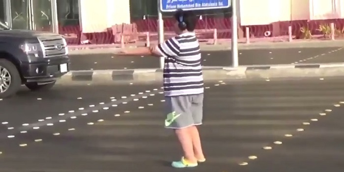 El menor, que llevaba un polo a rayas, pantalones cortos y auriculares, se paró en un paso de cebra en una calle llena de coches en Yeda y bailó durante un minuto la Macarena delante de los coches parados.