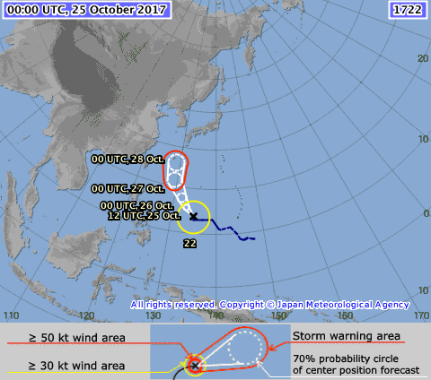 El nuevo tifón se encuentra ahora sobre alta mar, al este de Filipinas, con vientos de 72km/h (o 20 m/s) y rumbo hacia Okinawa a donde llegará, posiblemente, en la noche de este 27 de octubre.