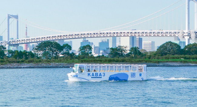TOKYO NO KABA es el autobús anfibio (va por tierra y agua) que el lunes inició un nuevo servicio dirigido a turistas extranjeros que recorre la Bahía de Tokio.