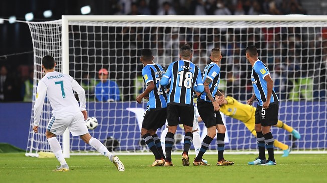 Un tanto de falta de Cristiano Ronaldo a los 53 minutos tumbó el planteamiento del Gremio brasileño y dio al Real Madrid su tercer Mundial de Clubes, igualando al Barcelona como equipo más laureado del torneo.