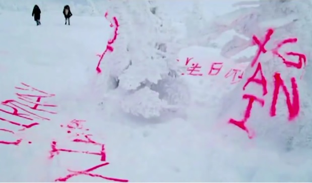 El hombre escribió varios mensajes en inglés y chino (entre ellos «feliz cumpleaños») en dos árboles cubiertos de nieve y en un área de 50 metros cuadrados de nieve.