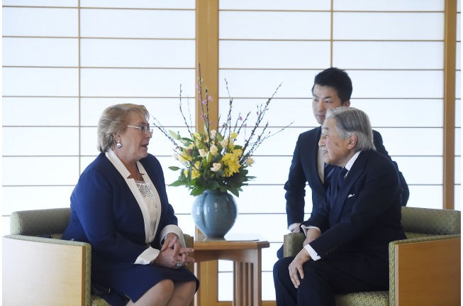 Akihito recibió a Bachelet hacia las 10.20 de la mañana hora local (01.20 GMT) a las puertas del Palacio Imperial donde los dos mandatarios celebraron una reunión de unos 30 minutos en un ambiente «familiar», según confirmó a Efe la Casa Imperial nipona.