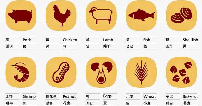 El restaurante de un hotel en Osaka, revela la agencia Kyodo, utiliza 14 pictogramas (cerdo, pollo, maní, pescado, huevo, etc.) para mostrar los insumos de sus platos. Se estima que unos 1.400 establecimientos de comida en Japón los emplean.