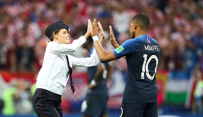 Cuatro personas interrumpieron brevemente el partido e incluso una de ellas llegó a chocar las palmas con el delantero francés Mbappe antes de ser retiradas del campo.