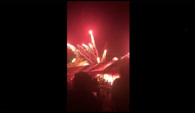 Una serie de fuegos artificiales que fueron lanzados al cielo de repente cayeron sobre la gente y explotaron.