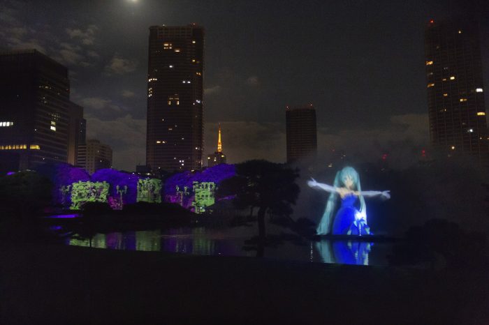 El momento más esperado fue la presentación de la famosa idol virtual, Miku Hatsune, cuyo holograma se proyectó sobre el estanque Shioiri del jardín de Hamarikyu.