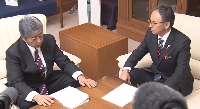 El gobernador okinawense pidió al gobierno central que reconsidere su decisión. Suga, según el gobernador, le dijo que el gobierno central reconoce la posición de Okinawa, pero que no dará marcha atrás.