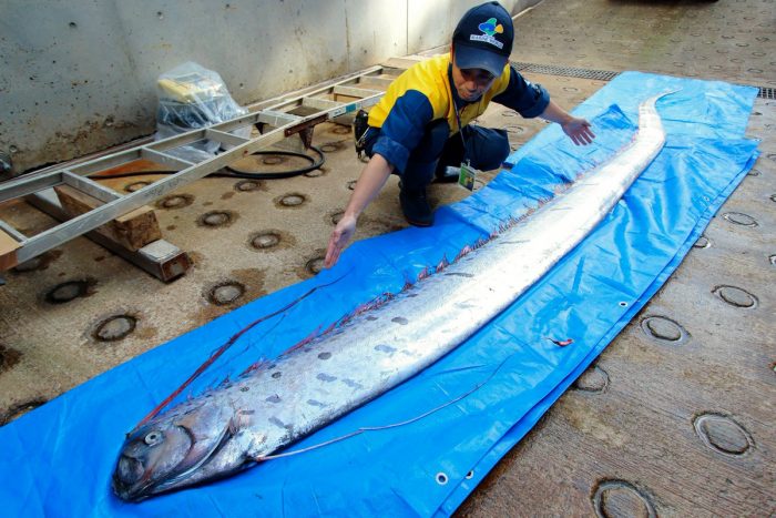 Es inusual verlo tan cerca de la superficie y de tanta longitud. El Pez Remo o Ryugonosukai, una variedad de gran tamaño que vive en las profundidades del mar, ha sido encontrado en la costa de la ciudad de Toyooka, en la prefectura de Hyogo, y será exhibido congelado en el acuario local, dijo NHK.