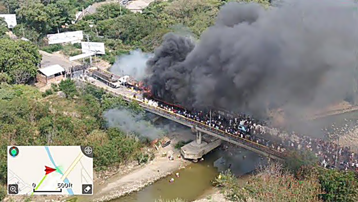 En el puente Francisco de Paula Santander fueron quemados dos camiones en el lado venezolano de la frontera, lo que obligó al Gobierno colombiano a ordenar el regreso de los vehículos a la bodega situada en el lado colombiano de Tienditas.