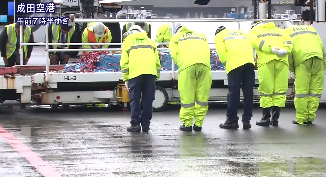 El cuerpo estaba dentro de un ataúd cubierto con una sábana azul. Se colocó un ramo de flores blancas sobre él y los funcionarios y trabajadores del Aeropuerto de Narita hicieron una profunda reverencia delante del cuerpo.