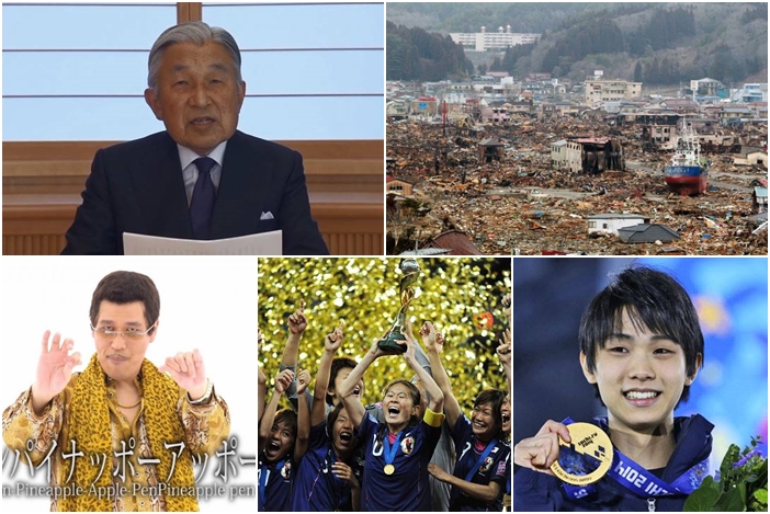 - El emperador Akihito dio un excepcional mensaje a la nación donde sugiere el deseo de abdicar al trono debido a su edad y a su estado físico. La abdicación de un Emperador nunca había ocurrido desde 1817cuando abdicó el emperador Kokaku. (8 de agosto)