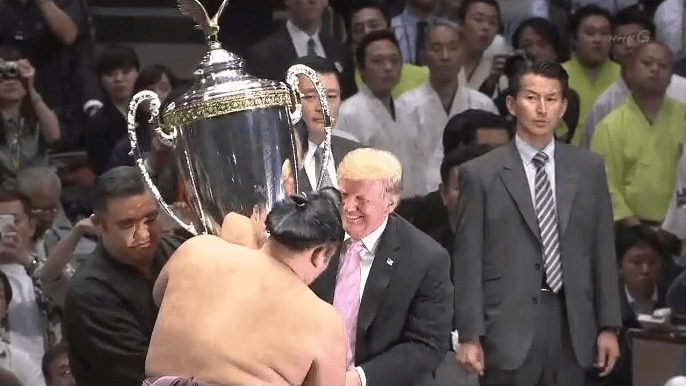 En medio del dohyo, al que accedió por una escalerilla especial, Trump leyó un diploma que entregó también a Asanoyama en el que señalaba que ha sido merecedor del trofeo por su «destacado éxito» en el torneo, con 12 victorias y 3 derrotas.