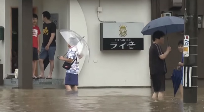 La estación de Saga está inundada. Un residente declaró a Kyodo: «Por lo general, me toma unos 5 minutos llegar a la estación desde mi casa, pero (hoy) me tomó una hora, ya que era difícil caminar con el agua hasta las rodillas».