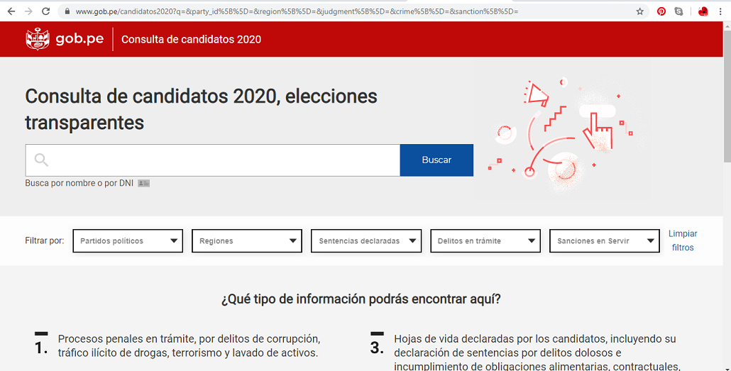 - La plataforma brinda la opción de filtrar la búsqueda según partidos políticos (22 en contienda), regiones y/o delitos.