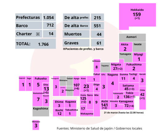 El número de personas que han sido dadas de alta hasta el 18 de marzo suman 766, de los cuales 551 son pasajeros y miembros de la tripulación del barco y 215 contaminados en las prefecturas de Japón.
