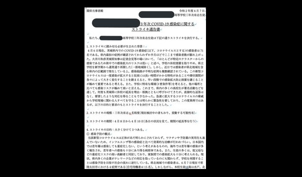 Son alumnos del tercer año de la escuela Hitachi Daiichi Koko quienes se organizaron y enviaron una carta de protesta a la Junta de Educación de la Prefectura, y a otras instituciones, exigiendo el cierre de todas las escuelas de Ibaraki hasta que se garantice el normal abastecimiento de mascarillas y se tomen medidas de seguridad sanitaria adecuadas ante el avance del virus.