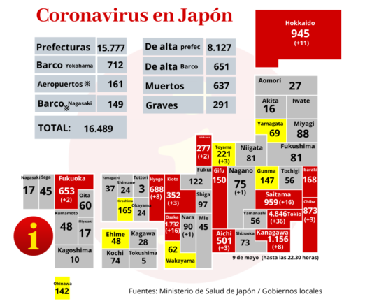 Hoy sábado 9 de mayo, el número de infectados en Japón subió a 15.777 casos tras confirmarse 114 nuevos contagiados en todo el país, según datos de los gobiernos locales y del Ministerio de Salud, Trabajo y Bienestar Social.