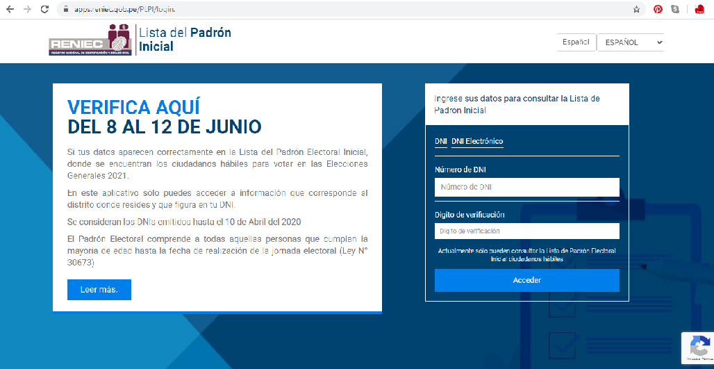 A partir de hoy, los ciudadanos perunos que quieran saber si están habilitados para sufragar en las Elecciones Generales 2021 pueden revisar el Padrón Inicial que estará publicado en la página web del RENIEC (CLIQUE AQUÍ) hasta el viernes 12 de junio.