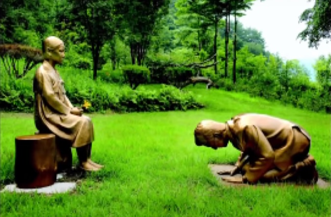 El jardín botánico, sito en la ciudad de Pyeongchang, presenta las dos estatuas bajo el título de “Una sincera disculpa”, revela Asahi Shimbun.