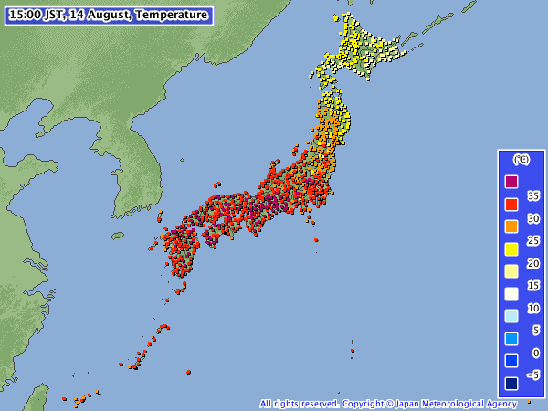 La Agencia Meteorológica de Japón dijo que la temperatura más alta del país estuvo hoy viernes y por segundo día consecutivo en la ciudad de Shimanto, prefectura de Kochi, donde se registró 39,8º. El calor también fue alto en el distrito de Tenryu, ciudad de Hamamatsu, con 39º.