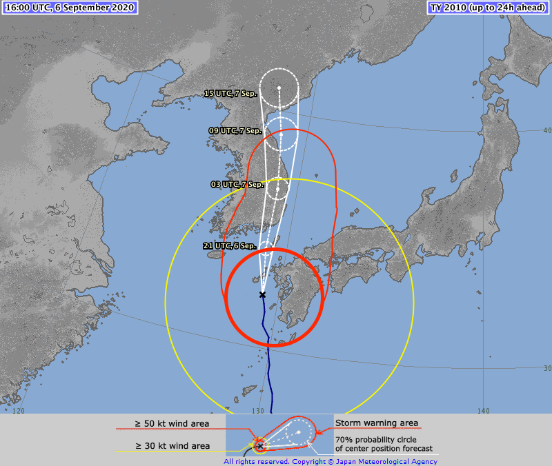 Se espera que se mueva hacia el norte, frente a la costa oeste de Kyushu hasta la mañana de este lunes 7 de septiembre y mantenga su rumbo hacia la península coreana.