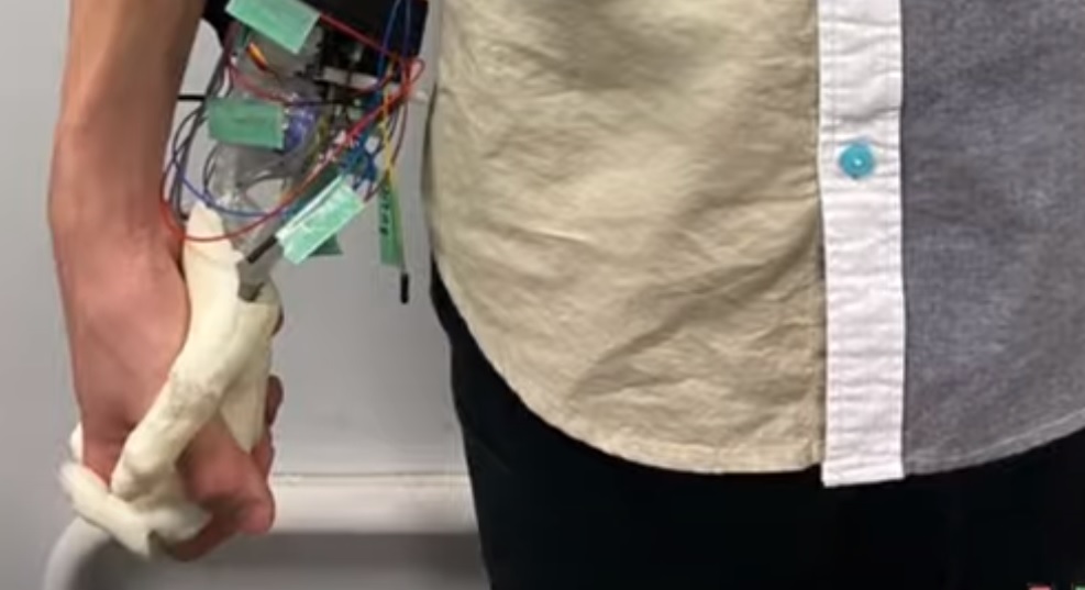 La mano tiene un sensor de presión interno. Cuando el usuario aprieta su palma, los motores se activan y la mano robótica reacciona apretando la palma del hombre.