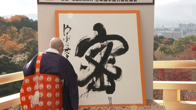 El líder budista Seihan Mori, del templo Kiyomizu en Kioto, escribió el kanji en una hoja de papel de 1,5 metros de largo y 1,3 m de ancho.