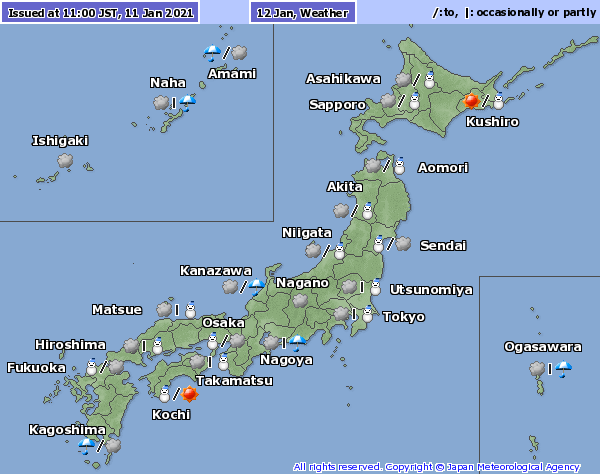 La Agencia dijo que una masa de aire de -6ºC se estacionará desde esta noche a unos 1.500 metros sobre Kanto/Koshin por lo que nevará y lloverá de forma intermitente hasta la noche de este martes 12 de enero.