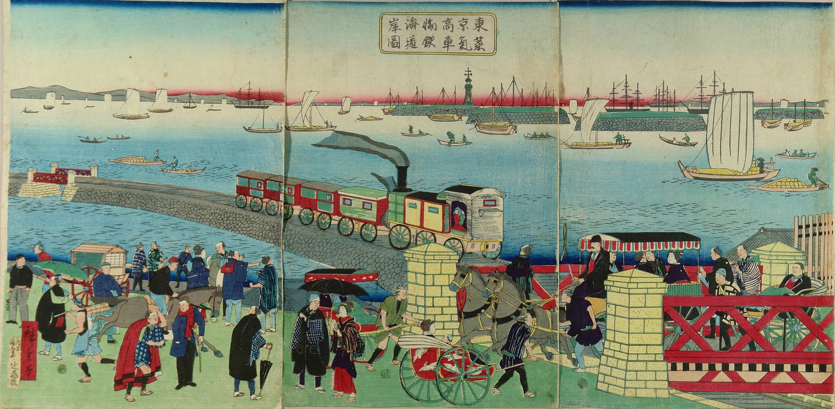 La base de la línea, rellenada con tierra y apuntalada con piedras, tenía un ancho de 6,4 metros y de 3 a 4 metros de alto, fue construida sobre aguas poco profundas. Sobre ella se extendió un riel de 2,7 km que unió la antigua Takanawa y Shinagawa.