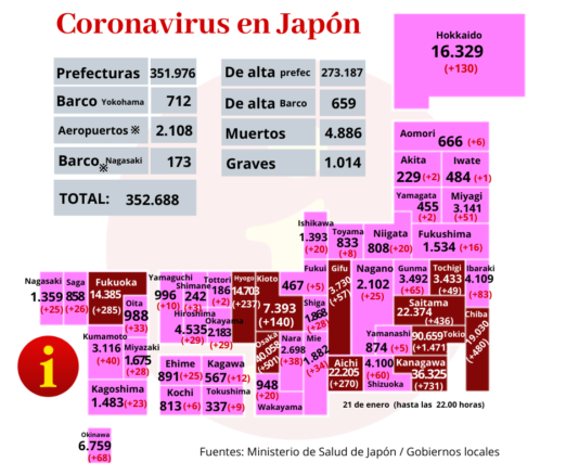 Hoy jueves 21 de enero, Japón confirmó hasta las 22.00 horas 5.652 nuevos casos de coronavirus y 94 muertos, según los datos del Ministerio de Salud, Trabajo y Bienestar Social.