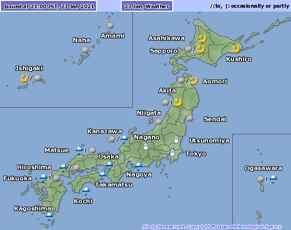 Hasta las 6 de la mañana la nevada será fuerte en las montañas de Koshin (Yamanashi, Nagano, Niigata) y en el noreste de la región de Kanto. En algunas partes altas de Tokio y Tama la nieve llegaría a 30 cm, en la llanura del noreste de Kanto a 10 cm y en los distritos de Tokio a unos 5 cm.