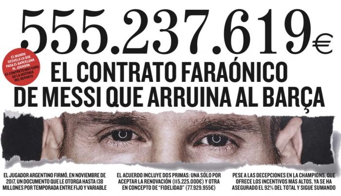 Mostrando la copia del acuerdo y bajo el titulo “El contrato faraónico de Leo Messi que arruina al Barcelona”, se informa que se trata del contrato, que vence el 31 de junio próximo, más alto de la historia del deporte.