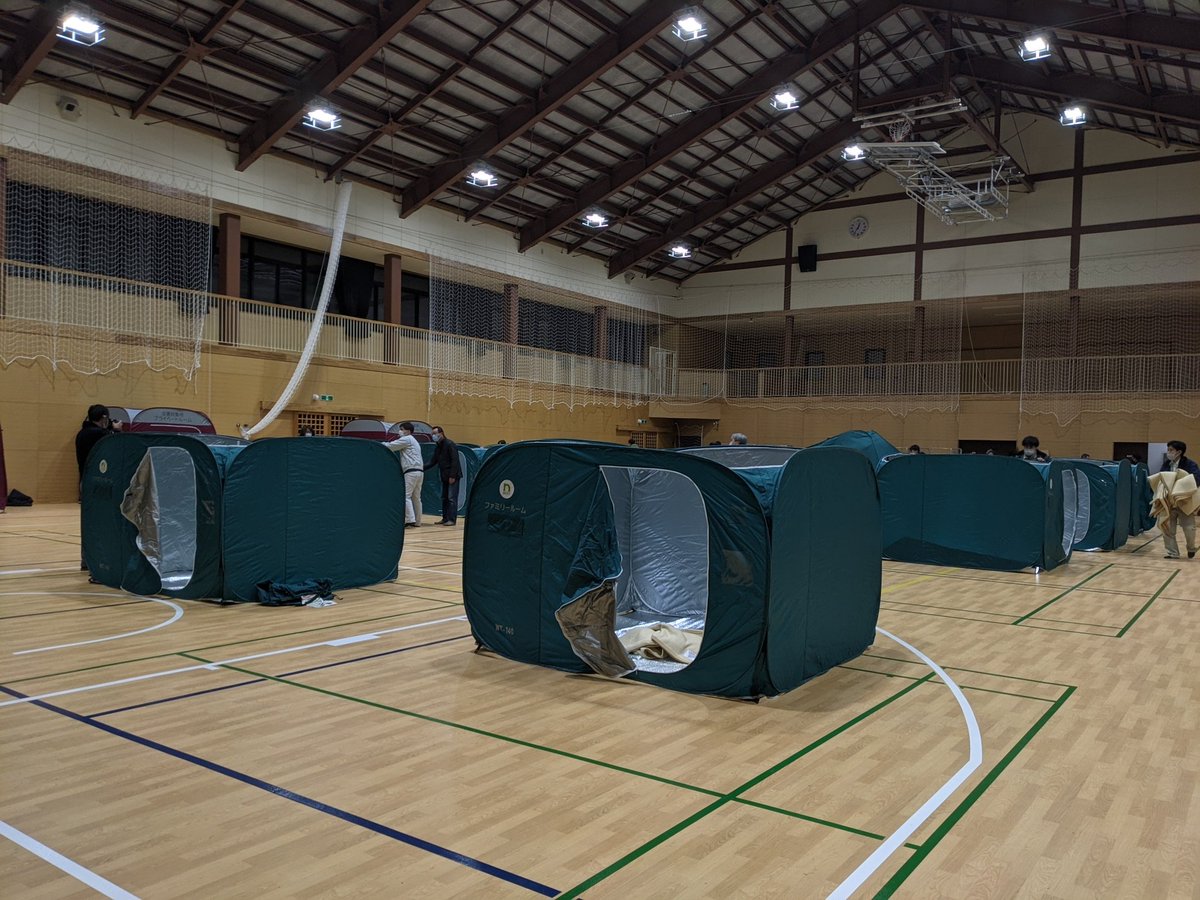 Un total de 92 personas llegaron al centro de evacuación montado en el Gimnasio de Soma, ciudad de la prefectura de Fukushima. Aquí se ofreció desinfectante en la entrada y se midió minuciosamente la temperatura. Los evacuados fueron distribuidos en novedosas carpas que garantizaron la distancia social y la privacidad mientras se abrieron regularmente las ventanas para hacer circular el aire.