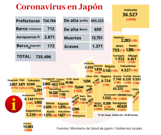 Hoy jueves 27 de mayo Japón confirmó hasta las 22.00 horas 4.140 nuevos casos de coronavirus y 106 muertos, según los datos del Ministerio de Salud, Trabajo y Bienestar Social.