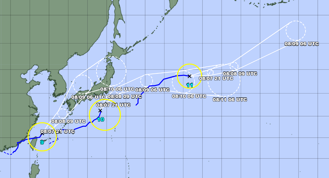 La Agencia Meteorológica prevé un clima especialmente duro en el Mar Pacífico a tempranas horas de este domingo 8 a causa de la cercanía del tifón Nº10, mientras que por el sur las complicaciones pueden comenzar el lunes 9 con la llegada del tifón Nº9 a la región de Kyushu.