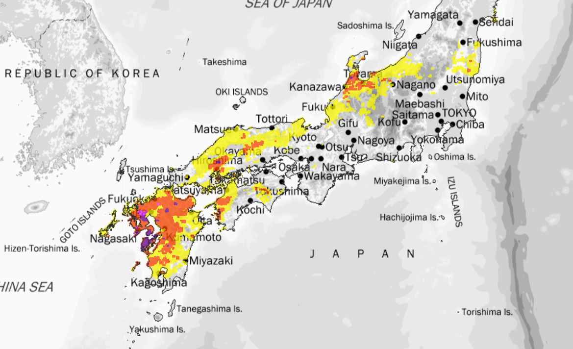 Lluvias récord en las regiones de Kyushu y Chugoku. La Agencia Meteorológica de Japón emitió esta mañana una «Alerta Especial» (Tokubetsu Keiho), el nivel más alto de alerta y evacuación, en la ciudad de Hiroshima. Dijo que el peligro para la vida era inminente y que era necesario tomar medidas inmediatas para garantizar la seguridad personal a causa de posibles deslizamientos y desborde de ríos.