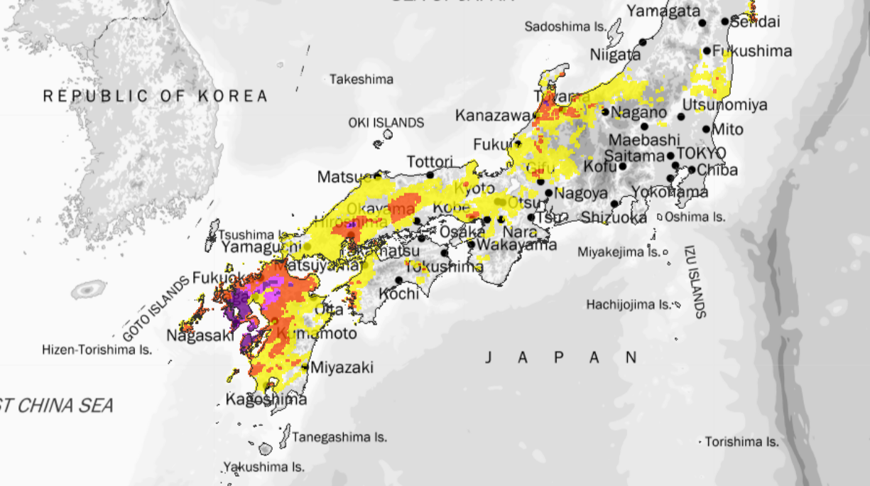 La Agencia Meteorológica de Japón dijo que es posible que las fuertes lluvias continúen con precipitaciones lineales en una amplia área del país. El frente de lluvias se extiende desde las cercanías del estrecho de Tsushima en Nagasaki hasta la región de Kanto Koshin, y se espera que se estanque cerca de Honshu durante la próxima semana. (RI/IP)