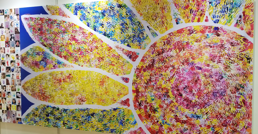 En el Teatro Metropolitano de Tokio se está exhibiendo hasta este 12 de septiembre un gran mosaico de un girasol creado con 6.000 huellas de manos realizado por la Asociación Hand Stamp Art Project, agrupación que se dedica a brindar apoyo de comunicación, integración y gastos médicos a niños en situación de discapacidad o con alguna enfermedad.