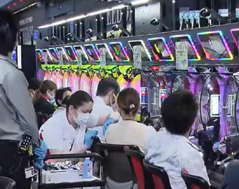 La sala de pachinko Freedom, ubicado cerca de la calle comercial Tenjinbashisuji en la ciudad de Osaka, comenzó hoy como punto de vacunación contra el coronavirus.