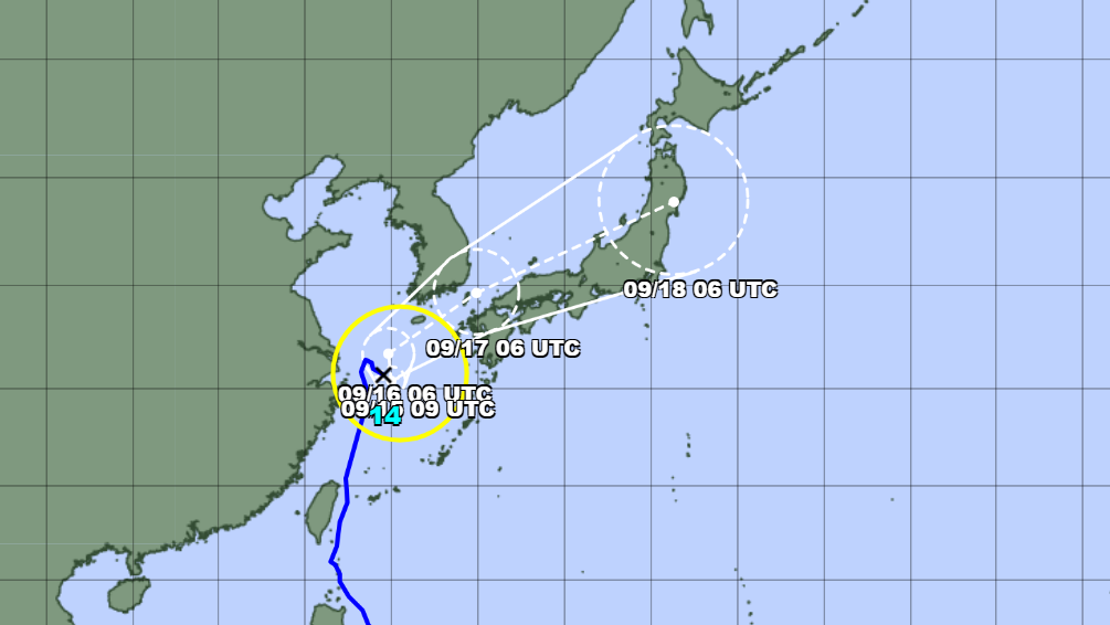 El tifón Nº14 avanza lentamente sobre el Mar de China Oriental y permanece casi estancado en el área. Se espera que entre este jueves y viernes avance hacia el noreste por las islas Tsushima. El sábado 18 podría convertirse en ciclón extra tropical para recorrer Japón hasta extremo norte.