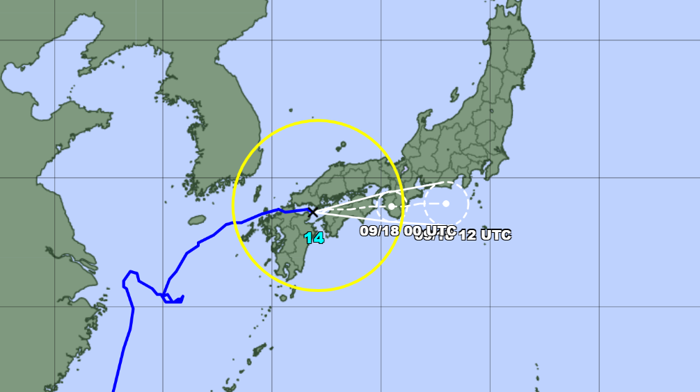El pronóstico de lluvias para este día 18 es de cuidado. Se espera una precipitación de 300 mm en la región de Shikoku (Tokushima, Kagawa, Ehime y Kochi), 250 mm en Tokai, 200 mm en Kinki y Kanto koshin, 180 mm en Tohoku y Hokkaido, además de 150 mm en Chugoku y 120 mm en Kyushu.