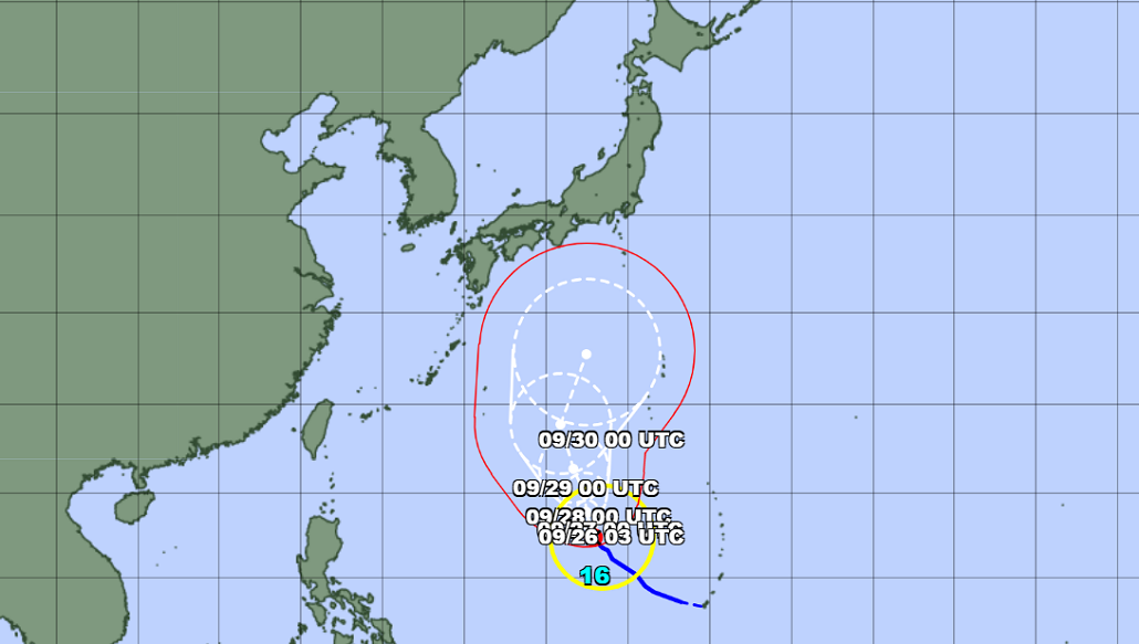 La Agencia Meteorológica de Japón reportó una nueva trayectoria del tifón Nº16 y su fortalecimiento. Los cálculos indican que se movería hacia el norte y que a mitad de la siguiente semana se acercaría al archipiélago.