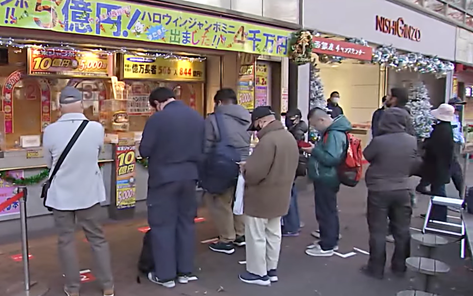 Una larga cola se formó en Nishi Ginza Chance Center en Tokio antes de que las ventas comenzaran a las 8.30 horas. Aquí se registran las mayores compras de lotería de Japón y donde es común que una persona adquiera 100 boletos de lotería o más.