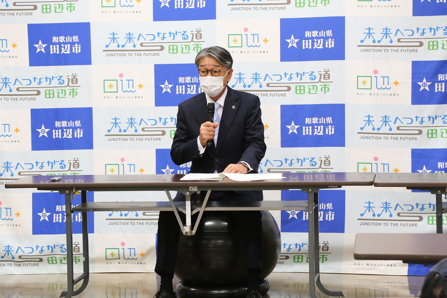 El alcalde de la ciudad de Tanabe, Mitsutoshi Manago, asistió esta semana a una conferencia de prensa sentado sobre una pelota de ejercicios como parte de una iniciativa impulsada por su municipio.