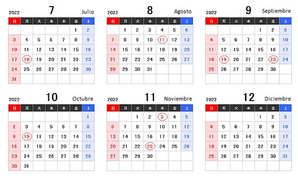 Pero este año habrá tres días festivos consecutivos nueve veces, incluidas las dos durante la Semana Dorada. Serán en: enero el «Día de la Mayoría de Edad», febrero el «Día de la Fundación Nacional», marzo «Día del Equinoccio de Primavera», abril «Día Showa», mayo «Día de la Constitución», «Día Verde» y «Día del Niño», julio «Día de la Mayoría de Edad», septiembre «Día del Equinoccio de Otoño» y octubre «Día del Deporte».