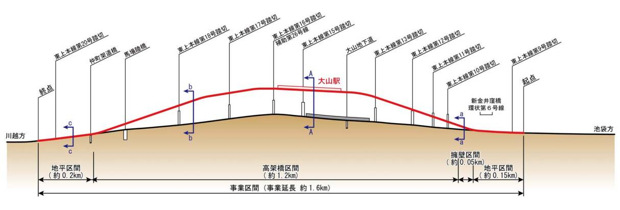 La construcción, que culminará en 2030, elevará la estación de Oyama y las vías del ferrocarril que se extienden antes y después a lo largo de 1.614 metros, de los cuales 1.200 metros serán un viaducto. Se moverá 100 metros la estación vecina de Naka-Itabashi, ubicada ahora a 1 km de Oyama, y se mantendrá unos 300 metros de calles secundarias unidas a vías férreas.