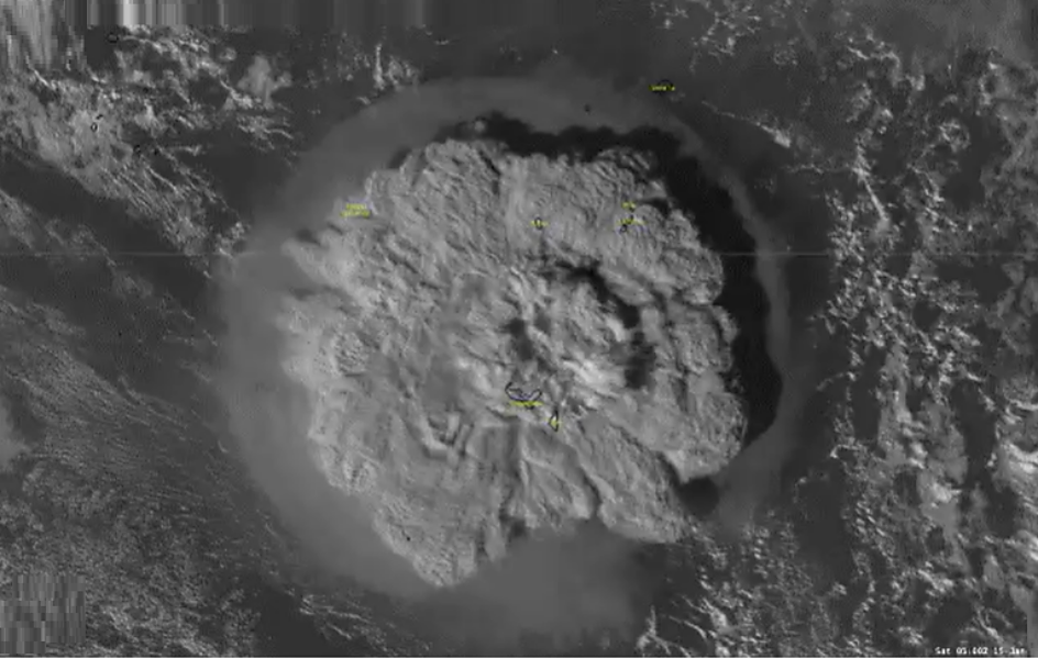 1.14.2021: Large volcanic eruption near Tonga (Hunga Tonga-Hunga Ha'apai volcano) today as seen from outer space. Shown on visible imagery using the Himawari satellite. #hiwx #tsunami #earthquake pic.twitter.com/zOTj6Qu1Wv