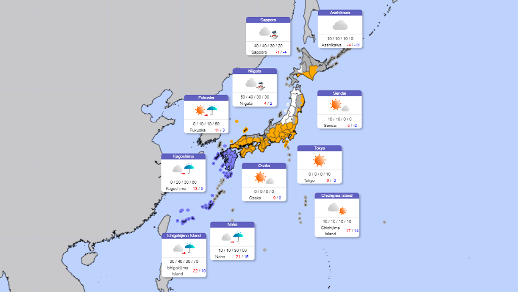 – En Nishinihon, sol por la mañana y lluvia desde la tarde.