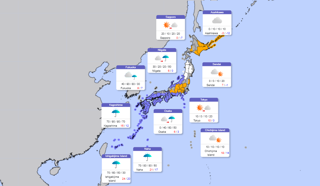 – Lluvia también desde Nishinihon a Tokai y nieve en algunas ciudades.
